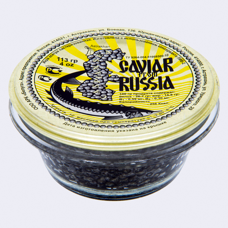 Икра настоящего астраханского осетра, выращенного в естественных условиях Каспийского бассейна, полученная прижизненным способом (ГОСТ-Р 55486-2013) и приготовленная по традиционному астраханскому рецепту.